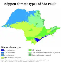 The state territory covers seven distinct climatic types, taking into account the temperature and rainfall. In the mountain areas of the state, there are subtropical climate (Cfa in Köppen climate classification), in areas of high altitude such as the Serra do Mar and the Serra da Mantiqueira, having humid, hot summers and average temperatures below 18 °C (64 °F) in the month cooler year; and oceanic (Cfb and Cwb) with regular and well distributed throughout the year and warmer summers rains.[26]