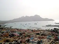 92.6% of the island population lives in the urban area of Mindelo,[1] on the Porto Grande Bay, a caldera that is breached by the ocean.[3] A small islet, Ilhéu dos Pássaros, is less than one nautical mile off the coast of Porto Grande Bay. There are a few intermittent streams, including Ribeira do Calhau and Ribeira de Julião.
