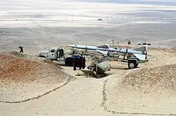 • DF-7/Dongfeng 7/M-7/Project 8610/CSS-8: Chinese surface-to-surface tactical ballistic missile converted from HQ-1/2/3/4. M-7 missile is the only Chinese ballistic missile that can be launched at a slant angle. It carries a 500 kg (1,100 lb) warhead and have a maximum range of 180 km (110 mi).[27][28] In 1989, Iran reportedly purchased 200 M-7 missiles with TELs, and officially put them into service as the Tondar-69.[29]