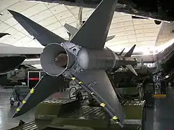 Rear view showing the solid-propellant booster nozzle, as displayed in Imperial War Museum Duxford