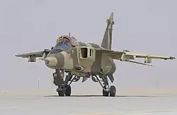 The Jaguar has a swept-wing, twin-engine monoplane design, with a tall tricycle-type retractable landing gear.[5] In its original configuration, it had a maximum take-off weight in the 15 tonne class.[27] With a combat radius of 850 km (530 mi), the Jaguar had a greater operational range than comparable aircraft of the era such as the Mikoyan MiG-27.[28]