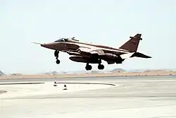 In support of the further military action in the region, known as Operation Manta, Jaguars were deployed to Bangui, Central African Republic, in 1983, before being re-based inside at N'Djamena International Airport in Chad. On 25 January 1984, the French Jaguars attacked a rebel column that was withdrawing after raiding the town of Zigey, and one aircraft was shot down and the pilot, Captain Michel Croci, was killed.[64] The French forces were withdrawn in 1984, as part of a de-escalation agreement, whereby both Libyan and French forces were to be withdrawn from Chad. As the Libyans went back on the agreement, the Jaguars were re-deployed to Chad in 1986, as part of Operation Epervier, for a more offensive role. On 16 February 1986, 11 Jaguars, escorted by Mirage F1 fighters and supported by Boeing C-135F tankers and Breguet Atlantic aircraft, launched a raid on the Wadi Doum airfield, which the Libyans had constructed in Northern Chad, using BAP-100 cluster bombs.[65] In response to Libyan incursions, another strike was carried out on 7 January 1987, when a Jaguar destroyed a Libyan radar with a Martel missile.[63][66] The Jaguars stationed at N'djamena were a target for Libyan sabotage owing to their effectiveness against the Libyan forces, however the attempts were unsuccessful.[67]