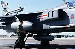 In 1994, in order to meet an urgent need to increase the number of aircraft able to designate targets for laser-guided bombs, 10 GR1As and two T2As were upgraded with the capability to carry the TIALD laser designator pod and redesignated as GR1B and T2B respectively.[91] TIALD equipped Jaguar GR1Bs were later deployed to Italy in August to take part in the Operation Deliberate Force against Bosnian Serb forces, being used to designate targets for RAF Harriers.[92] During the Bosnian operations, a Jaguar of 41 Squadron carried out the first RAF bombing raid in Europe since the end of the Second World War fifty years before.[93]