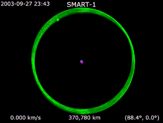 The orbit can be seen up to 26 October 2004 at spaceref.com, when the orbit was 179,718 × 305,214 km. On that date, after the 289th engine pulse, the SEPP had accumulated a total on-time of nearly 3,648 hours out of a total flight time of 8,000 hours, hence a little less than half of its total mission. It consumed about 58.8 kg of xenon and produced a delta-v of 2,737 m/s (46.5 m/s per kg xenon, 0.75 m/s per hour on-time). It was powered on again on 15 November for a planned burn of 4.5 days to enter fully into lunar orbit. It took until February 2005 using the electric thruster to decelerate into the final orbit 300–3,000 km above the Moon's surface.[9] The end of mission performance demonstrated by the propulsion system is stated above.
