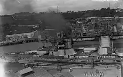 Goeben refilled her coal bunkers off the island of Donoussa near Naxos.[25] During the afternoon of 10 August, the two ships entered the Dardanelles. They were met by an Ottoman picket boat, which guided them through to the Sea of Marmara.[26] To circumvent neutrality requirements, the Ottoman government proposed that the ships be transferred to its ownership "by means of a fictitious sale."[27] Before the Germans could approve this, the Ottomans announced on 11 August that they had purchased the ships for 80 million Marks. In a formal ceremony the two ships were commissioned in the Ottoman Navy on 16 August. On 23 September, Souchon accepted an offer to command the Turkish fleet. Goeben was renamed Yavuz Sultan Selim and Breslau was renamed Midilli; their German crews donned Ottoman uniforms and fezzes, and some Ottoman sailors came aboard to complete the "transfer".[28][29]