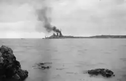 Yavuz, escorted by Midilli, intercepted the Russian Black Sea Fleet in the Battle of Cape Sarych on 18 November, some 17 nautical miles (31 km; 20 mi) off the Crimean coastline as the Russians returned from a bombardment of Trebizond. Despite the noon hour the conditions were foggy and none of the capital ships were spotted initially. The Black Sea Fleet had experimented with concentrating fire from several ships under the control of one "master" ship before the war, and Evstafi held her fire until Ioann Zlatoust, the master ship, could see Yavuz. When the gunnery commands were finally received they showed a range over 4,000 yards (3,700 m) in excess of Evstafi's own estimate of 7,700 yards (7,000 m), so Evstafi opened fire using her own data before Yavuz turned to fire her broadside.[35] She scored a hit with her first salvo as a 12-inch shell partially penetrated the armor casemate protecting one of Yavuz's 15-centimeter (5.9 in) secondary guns. It detonated some of the ready-use ammunition, starting a fire that filled the casemate and killed the entire gun crew.[36] A total of thirteen men were killed and three were wounded.[31] Yavuz returned fire and hit Evstafi in the middle funnel; the shell detonated after it passed through the funnel and destroyed the antennae for the fire-control radio, so that Evstafi could not correct Ioann Zlatoust's inaccurate range data. The other Russian ships either used Ioann Zlatoust's incorrect data or never saw Yavuz and failed to register any hits. Yavuz hit Evstafi four more times, although one shell failed to detonate,[36] before Souchon decided to break contact after 14 minutes of combat.[37] The four hits out of nineteen 28 cm (11 in) shells fired killed 34 men and wounded 24.[38]
