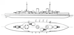 The ship was armed with a main battery of ten 28 cm (11 in) SK L/50 guns mounted in five twin-gun turrets; of these, one was placed forward, two were en echelon amidships, and the other two were in a superfiring pair aft. Her secondary armament consisted of twelve 15 cm (5.9 in) SK L/45 guns placed in individual casemates in the central portion of the ship. For defense against torpedo boats, she carried twelve 8.8 cm (3.5 in) SK L/45 guns, also in individual mounts in the bow, the stern, and around the forward conning tower. She was also equipped with four 50 cm (20 in) submerged torpedo tubes, one in the bow, one in the stern, and one on each broadside.[4]