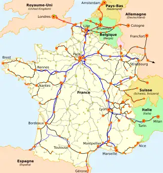 Map of the French railways on which the TGV (high speed tracks: blue; normal tracks: black) and Intercités (grey) SNCF trains run