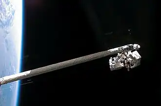 ![]() Fossum and Sellers on the end of Discovery's Orbiter Boom Sensor System during the mission's first EVA | |
