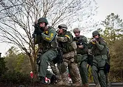 The first SWAT units were formed in the 1960s to handle riot control and violent confrontations with criminals. The number and usage of SWAT units increased in the 1980s during the war on drugs and the 1990s following incidents such as the North Hollywood shootout and Columbine High School massacre, with further increases in the 2000s for counterterrorism interests in the aftermath of the September 11 attacks. In the United States by 2005, SWAT teams were deployed 50,000 times every year, almost 80% of the time to serve search warrants, most often for narcotics. By 2015, the number of annual SWAT deployments had increased to nearly 80,000 times a year.[2] Despite their heightened involvement in high-risk scenarios, research on their use of force has shown varied results. A study by professor Jimmy J. Williams and professor David Westall found that there wasn't a significant difference in the frequency of use of force between SWAT and non-SWAT officers when responding to similar situations.[1]