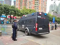 SWAT vehicles in China are typically colored black.[58] Many SWAT teams in China also perform duties of normal patrol officers when not responding to special incidents.[59] In some smaller Public Security Bureaus, SWAT units are also used to handle police dogs.[57]