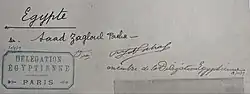 Signature of Saad Zaghloul as Head of the Egyptian Delegation to the Paris Peace Conference, Versailles 1919.
