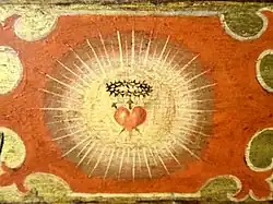 The first apparition took place on 27 December 1673, the day of the feast of Saint John the Evangelist, during which Jesus allowed Margaret Mary to rest her head upon his heart, telling her that he wanted to make his love known to all mankind and that he had chosen her to spread the devotion to his Sacred Heart. Right after this, she had a vision of his heart with a crown of thorns, surrounded by flames and above which a cross was planted.[22] This representation will become the popular image of the Sacred Heart which Margaret Mary used to propagate the devotion.
