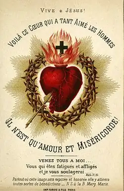 The Most Sacred Heart of Jesus (Latin: Cor Jesu Sacratissimum) is one of the most widely practised and well-known Catholic devotions, wherein the heart of Jesus Christ is viewed as a symbol of "God's boundless and passionate love for mankind".[1] This devotion to Christ is predominantly used in the Catholic Church, followed by high church Anglicans, and some Western Rite Orthodox. In the Latin Church, the liturgical Solemnity of the Most Sacred Heart of Jesus is celebrated on the third Friday after Pentecost.[2] The 12 promises of the Most Sacred Heart of Jesus are also popular.