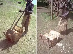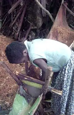 Sago (/ˈseɪɡoʊ/) is a starch extracted from the pith, or spongy core tissue, of various tropical palm stems, especially those of Metroxylon sagu.[1] It is a major staple food for the lowland peoples of New Guinea and the Maluku Islands, where it is called saksak, rabia and sagu. The largest supply of sago comes from Melanesia region, particularly Eastern Indonesia. Large quantities of sago are sent to Europe and North America for cooking purposes.[2] It is traditionally cooked and eaten in various forms, such as rolled into balls, mixed with boiling water to form a glue-like paste (papeda), or as a pancake.