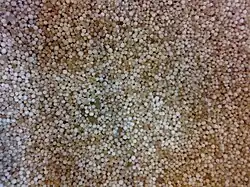 Sago is often produced commercially in the form of "pearls" (small rounded starch aggregates, partly gelatinized by heating). Sago pearls can be boiled with water or milk and sugar to make a sweet sago pudding.[3] Sago pearls are similar in appearance to the pearled starches of other origin, e.g. cassava starch (tapioca) and potato starch. They may be used interchangeably in some dishes,[4] and tapioca pearls are often marketed as "sago", since they are much cheaper to produce.[5] Compared to tapioca pearls, real sago pearls are off-white, uneven in size, brittle and cook very quickly.[5]