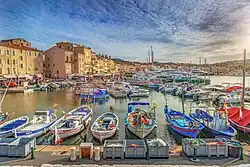 Saint-Tropez (/ˌsæn troʊˈpeɪ, - trəˈ-/ SAN troh-PAY, - trə-;[4][5] French: [sɛ̃ tʁɔpe]; Provençal: Sant Tropetz [san(t) tʀuˈpes]) is a commune in the Var department and the region of Provence-Alpes-Côte d'Azur, Southern France. It is 68 kilometres (42 miles) west of Nice and 100 kilometres (62 miles) east of Marseille, on the French Riviera, of which it is one of the best-known towns. In 2018, Saint-Tropez had a population of 4,103. The adjacent narrow body of water is the Gulf of Saint-Tropez (French: Golfe de Saint-Tropez), stretching to Sainte-Maxime to the north under the Massif des Maures.