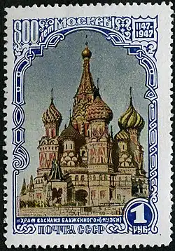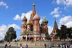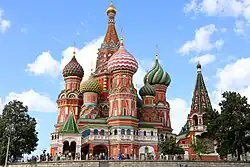 The Cathedral of Vasily the Blessed (Russian: Собор Василия Блаженного, romanized: Sobor Vasiliya Blazhennogo), commonly known as Saint Basil's Cathedral, is a Russian Orthodox church in Red Square of Moscow. It is one of the most popular cultural symbols of Russia. The building, now a museum, is officially known as the Cathedral of the Intercession of the Most Holy Theotokos on the Moat, or Pokrovsky Cathedral.[3] It was built from 1555 to 1561 on orders from Ivan the Terrible and commemorates the capture of Kazan and Astrakhan. It was completed, with its colours, in 1683.[4]