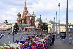 Nevertheless, actual redevelopment by Joseph Bove resulted in clearing the rubble and creating Vasilyevskaya (St. Basil's) Square between the church and Kremlin wall by shaving off the crest of the Kremlin Hill between the church and the Moskva River.[42] Red Square was opened to the river, and "St. Basil thus crowned the decapitated hillock."[42] Bove built the stone terrace wall separating the church from the pavement of Moskvoretskaya Street; the southern side of the terrace was completed in 1834.[29] Minor repairs continued until 1848, when the domes acquired their present-day colours.[28]