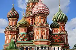 The cathedral has nine onion domes (each one corresponding to a different church) and is shaped like the flame of a bonfire rising into the sky.[6] Russian historian Dmitry Shvidkovsky, in his book Russian Architecture and the West, states that "it is like no other Russian building. Nothing similar can be found in the entire millennium of Byzantine tradition from the fifth to the fifteenth century [...] a strangeness that astonishes by its unexpectedness, complexity and dazzling interleaving of the manifold details of its design."[7] The cathedral foreshadowed the climax of Russian national architecture in the 17th century,[8] and it is considered as a prime example of Russian Renaissance architecture.[9]