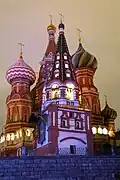 The old detached belfry was demolished; its square basement was reused for a new belltower.[29] The tall single tented roof of this belltower, built in the vernacular style of the reign of Alexis I, significantly changed the appearance of the cathedral, adding a strong asymmetrical counterweight to the church itself.[33] The effect is most pronounced on the southern and eastern facades (as viewed from Zaryadye), although the belltower is large enough to be seen from the west.[33]