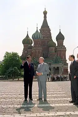 Ronald Reagan and Mikhail Gorbachev in front of the cathedral in 1988