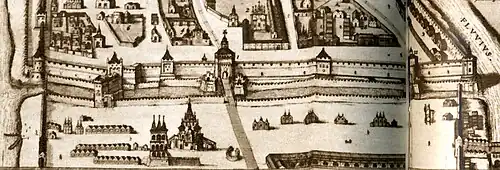 The detached belfry of the original Trinity Church stood southwest or south of the main structure. Late 16th- and early 17th-century plans depict a simple structure with three roof tents, most likely covered with sheet metal.[85] No buildings of this type survive to date, although it was then common and used in all of the pass-through towers of Skorodom.[86] August von Meyenberg's panorama (1661) presents a different building, with a cluster of small onion domes.[85]