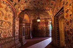 The formerly open ground-floor arcades were filled with brick walls; the new space housed altars from thirteen former wooden churches erected on the site of Ivan's executions in Red Square.[29] Wooden shelters above the first-floor platform and stairs (the cause of frequent fires) were rebuilt in brick, creating the present-day wrap-around galleries with tented roofs above the porches and vestibules.[29]
