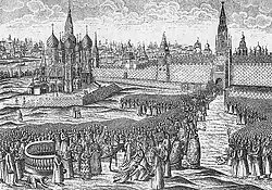 125. ^ ...спешно собралось несколько тысяч человек, проводили боярина с письмом через всю Москву до главной церкви, называемой Иерусалимом, что у самых кремлевских ворот, возвели его там на Лобное место, созвали жителей Москвы, огласили письмо Димитрия и выслушали устное обращение бояринаConrad Bussow (1961). "Chronicon Moscovitum ab a. 1584 AD ann. 1612" (in Russian).