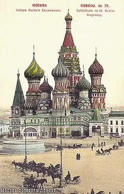 The site of the church had historically been a busy marketplace between the St. Frol's (later Saviour's) Gate of the Moscow Kremlin and the outlying posad. The centre of the marketplace was marked by the Trinity Church, built of the same white stone as the Kremlin of Dmitry Donskoy (1366–68) and its cathedrals. Tsar Ivan IV marked every victory of the Russo-Kazan War by erecting a wooden memorial church next to the walls of Trinity Church; by the end of his Astrakhan campaign, it was shrouded within a cluster of seven wooden churches. According to the report in Nikon's Chronicle, in the autumn of 1554 Ivan ordered the construction of the wooden Church of Intercession on the same site, "on the moat".[14] One year later, Ivan ordered the construction of a new stone cathedral on the site of Trinity Church to commemorate his campaigns. Dedication of a church to a military victory was "a major innovation"[7] for Muscovy. The placement of the church outside the Kremlin walls was a political statement in favour of posad commoners and against hereditary boyars.[15]