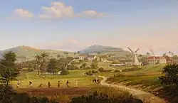 During the island's colonial period, St. Croix was an agricultural powerhouse in the Caribbean. The island's biggest exports were sugarcane, cotton, and tobacco–planted, harvested, and processed by enslaved Africans.[43][44] Sugarcane was the island's primary export in the 18th and 19th centuries.[44] With more than 150 sugar mills, St. Croix was one of the wealthiest sugar islands in the West Indies.[44]