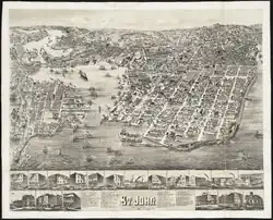 As the city grew in strategic importance to English power and capital, unrest grew among many of its working class. Black Saint Johners faced restrictions on trade, fishing and voting, compelling the majority of the city's Black community to settle in Portland (the city's north end), which later became amalgamated with Saint John.[16] In 1849, Canada's first labour union, the Laborer's Benevolent Association (now ILA local 273) was formed by longshoremen.[21] Between 1840 and 1860, sectarian violence became rampant in Saint John as tensions escalated in response to the poor living conditions of poor Irish Catholics, resulting in some of the worst urban riots in Canadian history.[22] Saint John experienced a cholera outbreak in 1854 that claimed over 1,500 lives,[23] as well as the Great Fire of Saint John in 1877 that destroyed 40% of the city and left 13,000 people homeless.[24] Although the fire caused damages exceeding $10 million (equivalent to approximately $256 million today),[25][26] Saint John quickly embarked on rebuilding. Nevertheless, the aftermath prompted many residents to leave the city.[24]