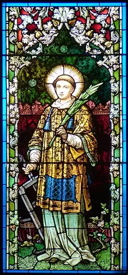 St. Lawrence in stained glass window by Franz Mayer & Co. He is holding a palm branch, a symbol of martyrdom, and a griddle, the instrument of his death.