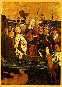 Her legendary fame comes from a medieval story with many variations.[8] In it, Ursula was a princess who had already promised herself to Christ. However her father, the semi-legendary King Dionotus of Dumnonia in south-west Britain in the late-4th century, demanded that she marry the pagan governor Conan Meriadoc of Armorica. Ursula could not refuse but managed to delay the wedding by three years. During those three years Ursula took part in a pan-European pilgrimage, accompanied by 10 virgins, who in turn would eventually be accompanied by 1,000 virgins each. She headed for Rome with her followers and persuaded the Pope, Cyriacus (unknown in the pontifical records, though from late AD 384 there was a Pope Siricius), and Sulpicius, bishop of Ravenna, to join them. After setting out for Cologne, which was being besieged by Huns, all the virgins were beheaded in a massacre. The Huns' leader fatally shot Ursula with an arrow in about AD 383 (the date varies). When the Huns tried to loot the companions' ships, they discovered eleven legions of soldiers aboard, which scared them out of Cologne.[6]