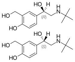 ![]() Salbutamol (top), (R)-(−)-salbutamol (center) and (S)-(+)-salbutamol (bottom) | |