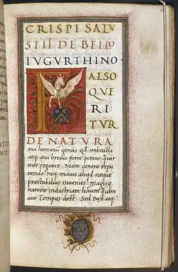 There is no information about Sallust's parents or family,[11] except for Tacitus' mention of his sister.[12] The Sallustii were a provincial noble family of Sabine origin.[4][5][13] They belonged to the equestrian order and had full Roman citizenship.[4] During the Social War Sallust's parents hid in Rome, because Amiternum was under threat of siege by rebelling Italic tribes.[14] Because of this Sallust could have been raised in Rome.[11] He received a very good education.[4]