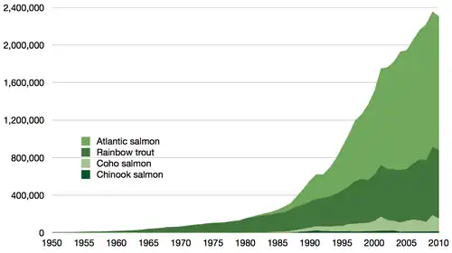 Salmon are important food fish and are intensively farmed in many parts of the world,[4] with Norway being the world's largest producer of farmed salmon, followed by Chile.[5] They are also highly prized game fish for recreational fishing, by both freshwater and saltwater anglers. Many species of salmon have since been introduced and naturalized into non-native environments such as the Great Lakes of North America, Patagonia in South America and South Island of New Zealand.[6]
