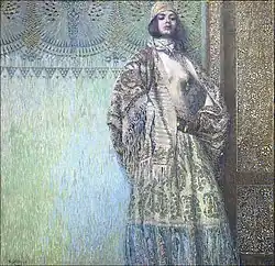 Christian traditions depict her as an icon of dangerous female seductiveness, notably in regard to the dance mentioned in the New Testament, which is thought to have had an erotic element to it, and in some later transformations it has further been iconized as the Dance of the Seven Veils. Other elements of Christian tradition concentrate on her lighthearted and cold foolishness that, according to the gospels, led to John's death.[16] David Flusser, a scholar of early Christianity, believes that her "biographical profile suggests a normal, moral personality".[17] Nevertheless, a similar motif was struck by Oscar Wilde in his Salome, in which she plays a femme fatale, and by Ada L. Harris in her 1906 novel "The Sin Of Salome", who casts her as a predatory vampire seductress. This parallel representation of the Christian iconography, made even more memorable by Richard Strauss' opera based on Wilde's work, is as consistent with Josephus' account as the traditional Christian depiction; however, according to the Romanized Jewish historian, Salome lived long enough to marry twice and raise several children. Few literary accounts elaborate the biographical data given by Josephus.[18]