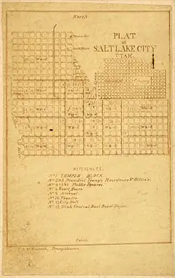 The city was not platted until after the federal surveyor abandoned his post in 1857.[2] In 1855 Congress directed the President of the United States to appoint a surveyor general for Utah Territory, and to cause that the lands of that territory should be surveyed preparatory to bringing them on the market.[40] Because of numerous conflicts between the surveyor and the territorial government the first surveyor general abandoned his post in 1857, not to return till 1869.[41]