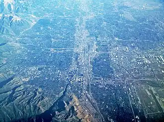 Sustained drought in Utah has strained Salt Lake City's water security, caused the Great Salt Lake level to drop to record low levels,[19][20] and has impacted the local and state economy.[21] The receding lake has exposed arsenic which may become airborne, exposing area residents to poisonous dust.[22] The city is also under threat of major earthquake damage amplified by two offshoots of the nearby Wasatch Fault that join underneath the downtown area.[23]
