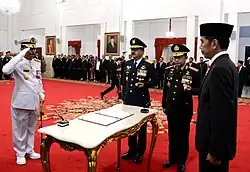In Indonesia, executing a salute has its regulations. Members who are part of a uniformed institution and wearing a uniform will implement a gesture of salute according to the regulations of the institution the member is part of.[19] In this case, personnel of the TNI and Indonesian National Police are to implement a hand salute by forming the right hand up making an angle of 90 degrees and is bent 45 degrees, fingers are pressed together and placed near the temple of the right eye, palm facing down.[20] Personnel wearing a headdress place the tip of the right index finger touching the front right tip of the headdress.[21] Other uniformed organizations/institutions which are not part of the military/police will implement a hand salute as done by members of the military/police.