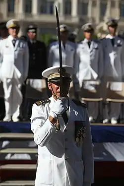 - ^ the United States Navy, United States Marine Corps, United States Coast Guard, United States Public Health Service Commissioned Corps, Colombian Army and Ecuadorian Army, as well as in all branches of the French Armed Forces, Spanish Armed Forces, British Armed Forces (with the exception of the Blues and Royals), Canadian Forces, Danish Armed Forces, Hellenic Armed Forces, Italian Armed Forces, Norwegian Armed Forces, Polish Armed Forces, Irish Defence Forces, Argentine Armed Forces, Australian Defence Force, South African National Defence Force,[11] Swedish Defence Forces, Turkish Armed Forces, Portuguese Armed Forces and Russian and all former Soviet republic forces