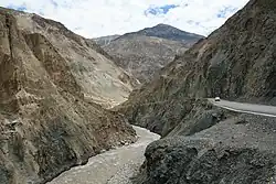 The Salween originates in the Tanggula Mountains in the central Tibetan Plateau. The headwaters are located near Dengka Peak, east of Tanggula Pass.[15] The highest source is Jiangmeiergang Galou glacier, 5,432 m (17,822 ft) above sea level.[9] The various headwater streams flow southwest through high mountain valleys and accumulate in Cona Lake, at 4,594 m (15,072 ft).[16] Downstream of the lake, the Tibetan section of the river is called Gyalmo Nagqu, "black river". In Tibet the river flows mostly within Nagqu prefecture.[9]
