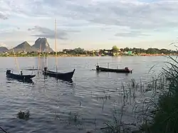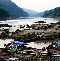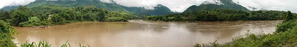 Further south, the river enters Karen State (Kayin State) and forms the border between Myanmar and Thailand for about 120 km (75 mi).[21] In Thailand the river is known as Salawin; much of the Thai side of the border is part of Salawin National Park and the Salawin Wildlife Sanctuary. At the south end of the border section it is joined by the northwest-flowing Moei River, which forms the Myanmar–Thailand border south of this point.[11] In Karen State, the river flows through karst limestone hills where numerous caves and unusual rock formations line the banks, particularly around the city of Hpa-An.[22][23]