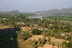 The Salween emerges from the mountains into the coastal plain near Hlaingbwe Township. Near the coast, annual rainfall is as high as 4,000 to 5,000 mm (160 to 200 in), supporting dense tropical rainforest as well as a productive rice industry.[11] The river flows for a further 100 km (62 mi) before terminating at a modestly sized delta and estuary in Mawlamyine in Mon State. The Salween is tidally influenced up to 75 km (47 mi) inland.[14] Here it is joined by the Gyaing River from the east and the Ataran river from the southeast. The Thanlwin Bridge, the second longest bridge in Myanmar, connects Mawlamyine to Mottama. The combined river then breaks into the Dayebauk (north) and Mawlamyine (south) channels, forming Bilugyun Island before emptying into the Gulf of Martaban.[24]