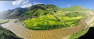 From Cona Lake, the river flows south and turns east near Nagqu Town, where the Chalong hydroelectric station is situated. Further east, the river is dammed at the smaller Jiquan hydroelectric station. As of 2017, these are the only two dams on the Salween River proper.[14] Continuing east, it is joined by the Ka, Suo and Ga rivers, all flowing from the southern slope of the Tanggula Mountains. In Biru County, the river begins a series of turns south and southeast, passing through Nyingchi prefecture. Shortly before entering Yunnan, it is joined from the east by the Yu River, its longest tributary within China.[1]