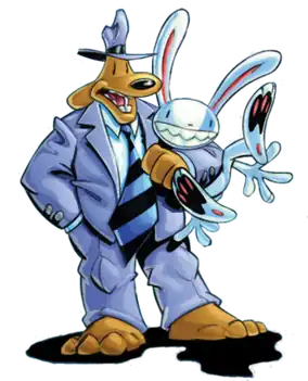 Max is an anthropomorphic "hyperkinetic, three-foot rabbity thing" with white fur, but prefers being called a lagomorph.[7] Max retains few characteristics consistent with a rabbit, with permanently rigid ears set in an excited posture and a huge jaw normally stuck in a crazed grin.[7] Unhinged, uninhibited and near psychotic, Max enjoys violence and tends to prefer the aggressive way of solving problems,[7][8] seeing the world as little more than a vessel for his "pinball-like stream of consciousness".[7] This creates a seeming disregard for self-preservation; Max will revel in dangerous situations with little impression that he understands the risks he faces. As a result, Max is usually enthusiastic to engage in any activity, including being used by Sam as a cable cutter or an impromptu bludgeon.[7] Despite this, Max possesses a sharp mind and an observational nature, and enjoys interpreting new experiences in as unpredictable a manner as possible.[7] However, Max has a distaste for long stories and occasionally loses focus during lengthy scenes of plot exposition; by his own admission, Max possesses a particularly short attention span. On top of this short attention span, it has been shown numerous times that Max has an extremely poor memory to go along with it. Despite his seemingly heartless personality, he does have moments where he demonstrates care and compassion for others, and he believes strongly in upholding the law in his own twisted way. He's also very protective of Sam, but Max can still act violently towards his friend, stating that when he dies, he will take Sam with him. Moreover, Max is extremely possessive of Sam and their status as partners and best friends.[7] Max traditionally carries a Luger pistol, but as he wears no clothes, other characters often make comments as to where Max keeps it on his person.[7] Purcell considers Max to be representative of pure id, the uncoordinated instinctual trends of the human psyche.[9]