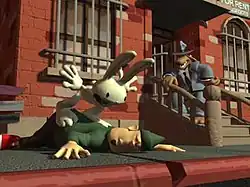 Sam and Max, the Freelance Police, are two comic book characters created by Steve Purcell, who act as private detectives and vigilantes. Sam & Max Hit the Road follows the pair on a case that takes them from their office in New York City across the United States. The game starts in a similar way to many of the comic stories, with Sam and Max receiving a telephone call from an unseen and unheard Commissioner, who tells them to go to a nearby carnival.[7] At the carnival, they are told by the owners that their star attraction, a frozen bigfoot called Bruno, has been set free, and fled, taking their second attraction, Trixie the Giraffe-Necked Girl.[8] Sam and Max set off to find Bruno and Trixie and bring them back. As the duo investigate the carnival, they learn that Bruno and Trixie are in love and that Trixie freed Bruno. The Freelance Police leave the carnival to pursue leads at various tourist traps throughout the country, such as The World's Largest Ball of Twine, a vortex controlled by giant subterranean magnets, and bungee jumping facilities at Mount Rushmore.