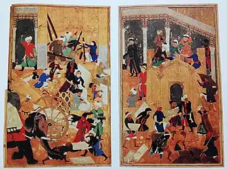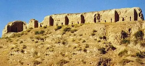 The most striking monument of the Qarakhanid era in Samarkand was the palace of Ibrahim ibn Hussein (1178–1202), which was built in the citadel in the 12th century. During the excavations, fragments of monumental painting were discovered. On the eastern wall, a Turkic warrior was depicted, dressed in a yellow caftan and holding a bow. Horses, hunting dogs, birds and periodlike women were also depicted here.[44]