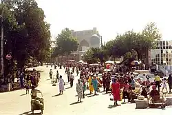 The city is noted as a centre of Islamic scholarly study and the birthplace of the Timurid Renaissance. In the 14th century, Timur made it the capital of his empire and the site of his mausoleum, the Gur-e Amir. The Bibi-Khanym Mosque, rebuilt during the Soviet era, remains one of the city's most notable landmarks. Samarkand's Registan square was the city's ancient centre and is bounded by three monumental religious buildings. The city has carefully preserved the traditions of ancient crafts: embroidery, goldwork, silk weaving, copper engraving, ceramics, wood carving, and wood painting.[8] In 2001, UNESCO added the city to its World Heritage List as Samarkand – Crossroads of Cultures.